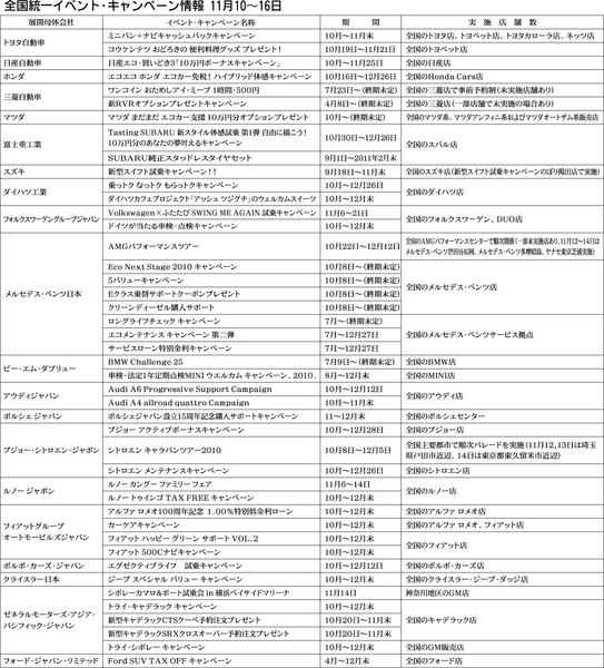 11月10~16日の期間中に自動車メーカーやインポーターなどが全国ネットワークで展開するイベント、統一キャンペーンでは、日本車と輸入車の一部ブランド各社がエコカー減税対象車を訴求するキャンペーンの継続や、サービス入庫を促進するキャンペーン...