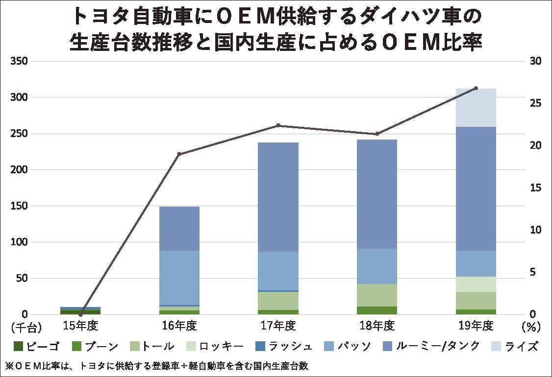 ダイハツ工業がトヨタ自動車にOEM(相手先ブランドによる生産)供給する小型車の生産台数を増やしている。国内生産台数(含軽)に占めるトヨタ向け小型車の比率は、2016年の「ルーミー/タンク」の供給開始を機に上昇し、19年度には約3割に増加し...