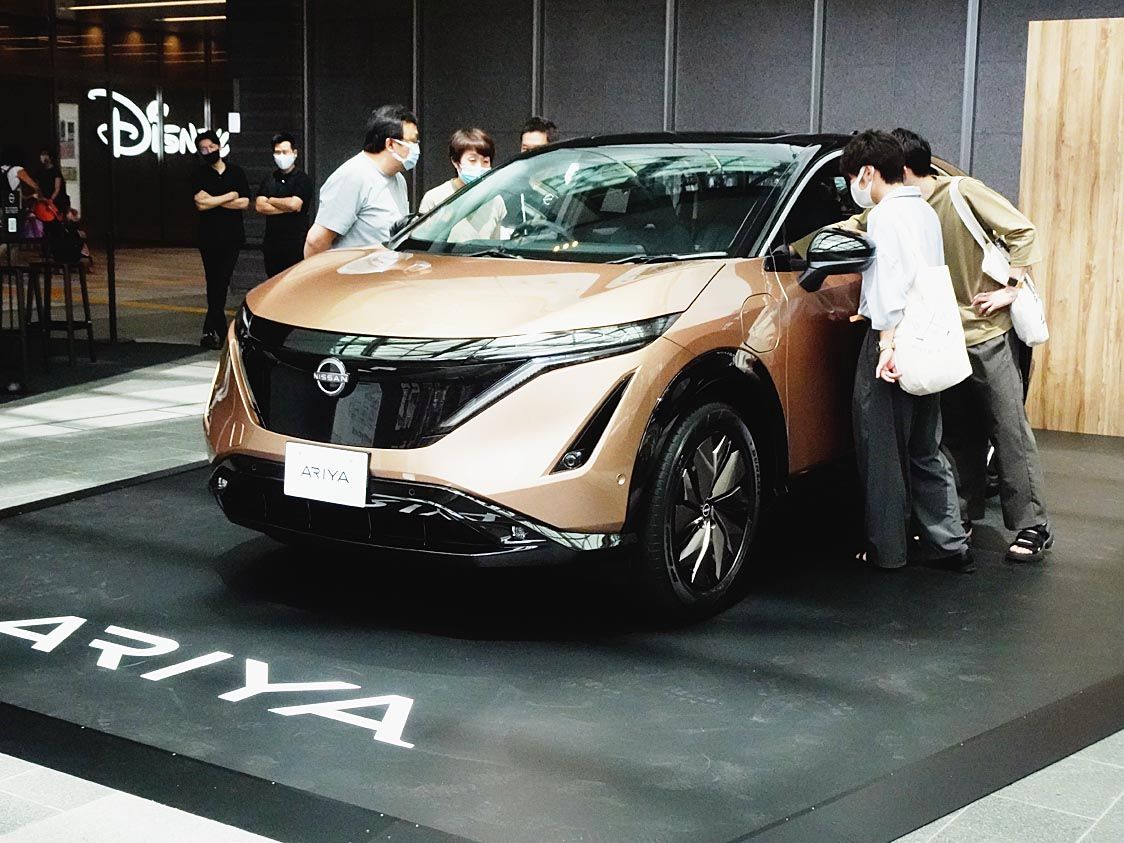 日産自動車は3日、新型電気自動車(EV)「アリア」の展示・試乗などを10月末までに全国の主要都市10カ所で行うキャラバンを名古屋市から開始した=写真。同車の専用会員サイトに登録した会員のほか、イベント会場周辺を往来する一般ユーザーにも実車...