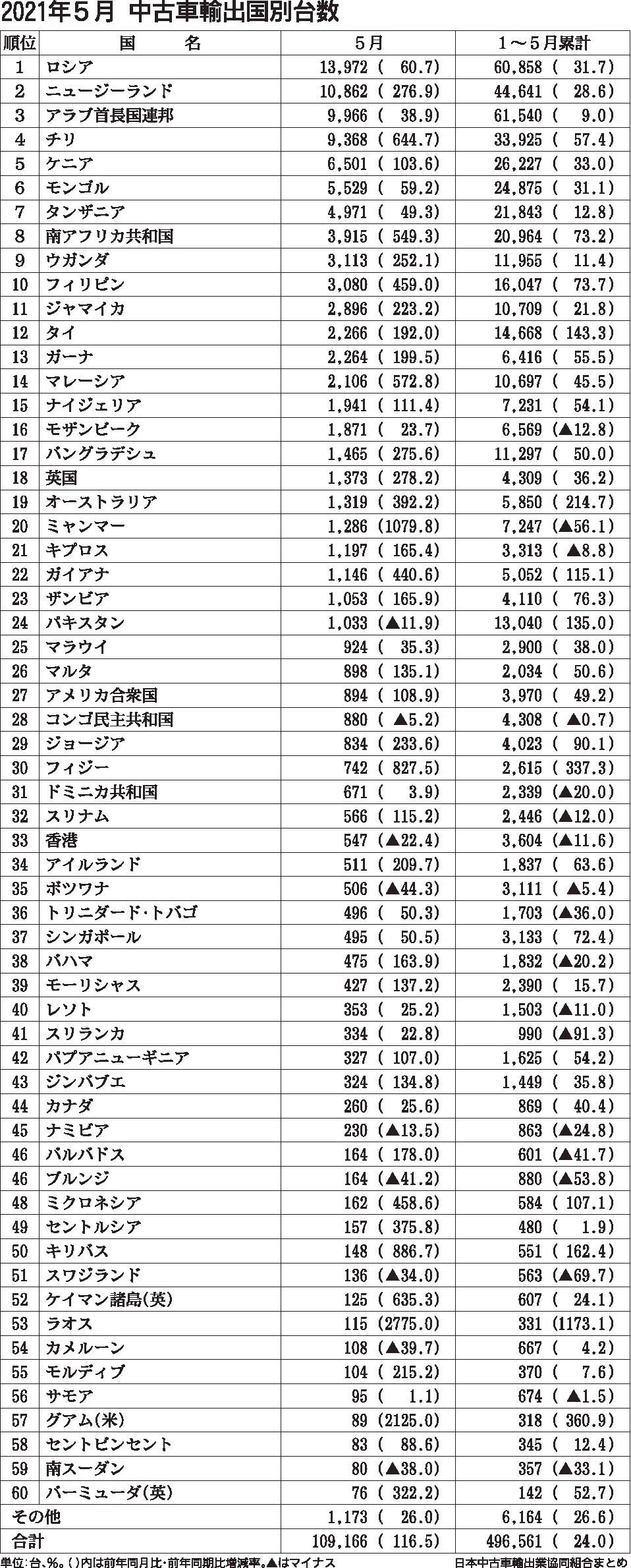 日本中古車輸出業協同組合(佐藤博理事長)がまとめた2021年5月の中古車輸出台数は、前年同月比116・5%増の10万9166台だった。前年実績を上回ったのは2カ月連続。新型コロナウイルス感染拡大で経済活動が停滞していた前年の反動増に加え、...