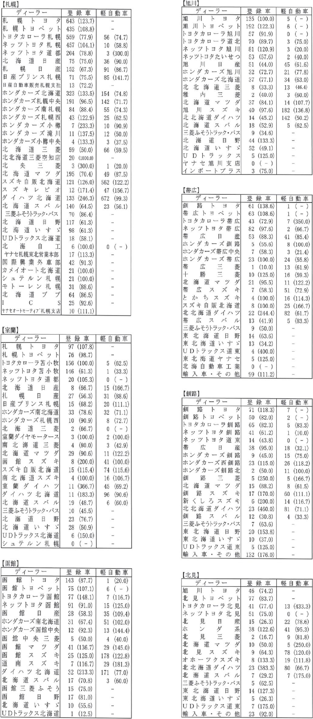 〈8月度全道管内別ディーラー別新車登録・届け出台数〉