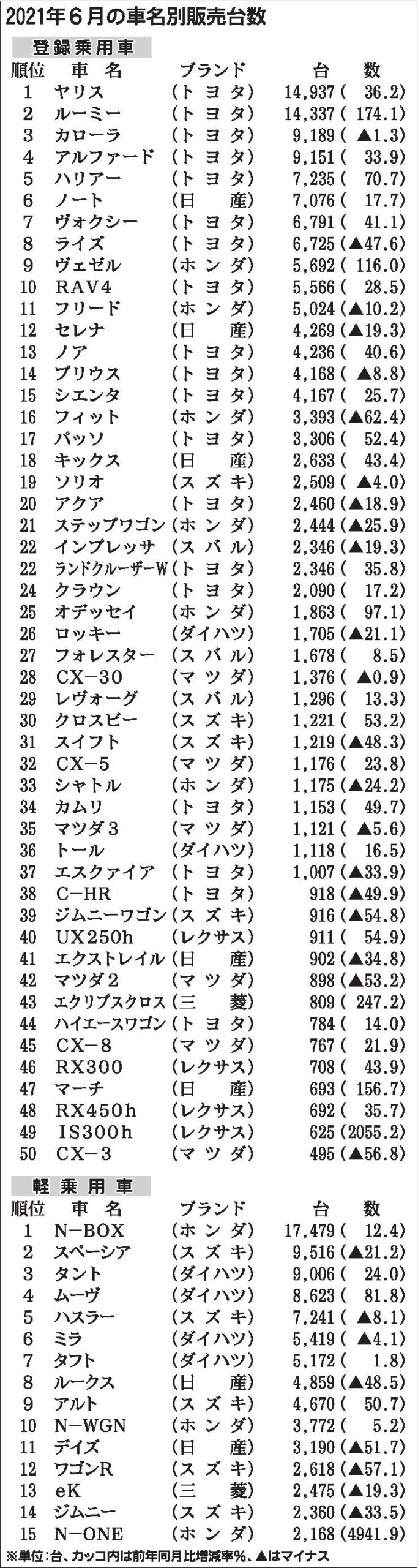 2021年6月の新車販売ランキング、「N‐BOX」が10カ月ぶりに首位奪還 「ヴェゼル」は登録車9位に