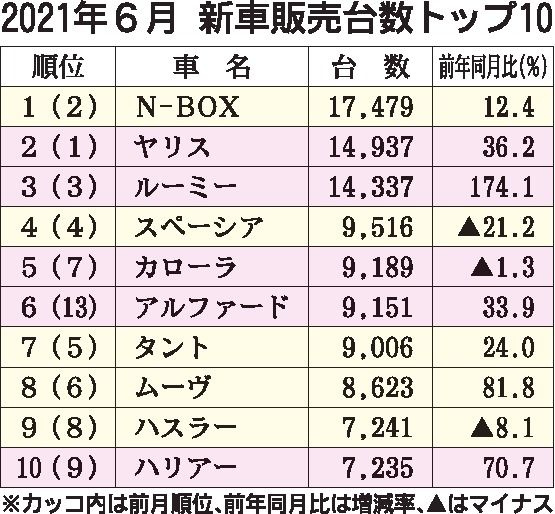 6月の車名別新車販売台数でホンダ「N―BOX(エヌボックス)」が10カ月ぶりにトップに立った。前年同月比12・4%増となる1万7479台を販売し、半導体不足による生産調整を行った2位のトヨタ自動車「ヤリス」を約2500台上回った。3位は3...