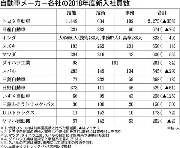 自動車メーカー各社の2018年度新入社員は、前年度実績比で約260人減の約7500人となった。超売り手市場で人材獲得競争が激化する中、各社ともに新卒採用はほぼ計画通りだった模様だ。すでに19年度採用計画を公表したメーカーの多くはほぼ前年並...