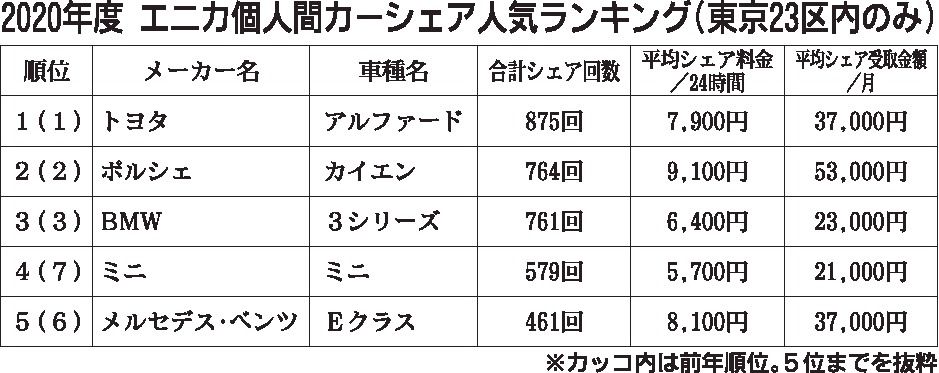 DeNA SOMPOモビリティ(DSM、馬場光社長、東京都渋谷区)は7日、個人間カーシェアリング「エニカ」のシェア回数ランキングを発表した。2020年度(20年4月~21年3月)に東京23区内で最もシェア回数が多かったのはトヨタ自動車「ア...