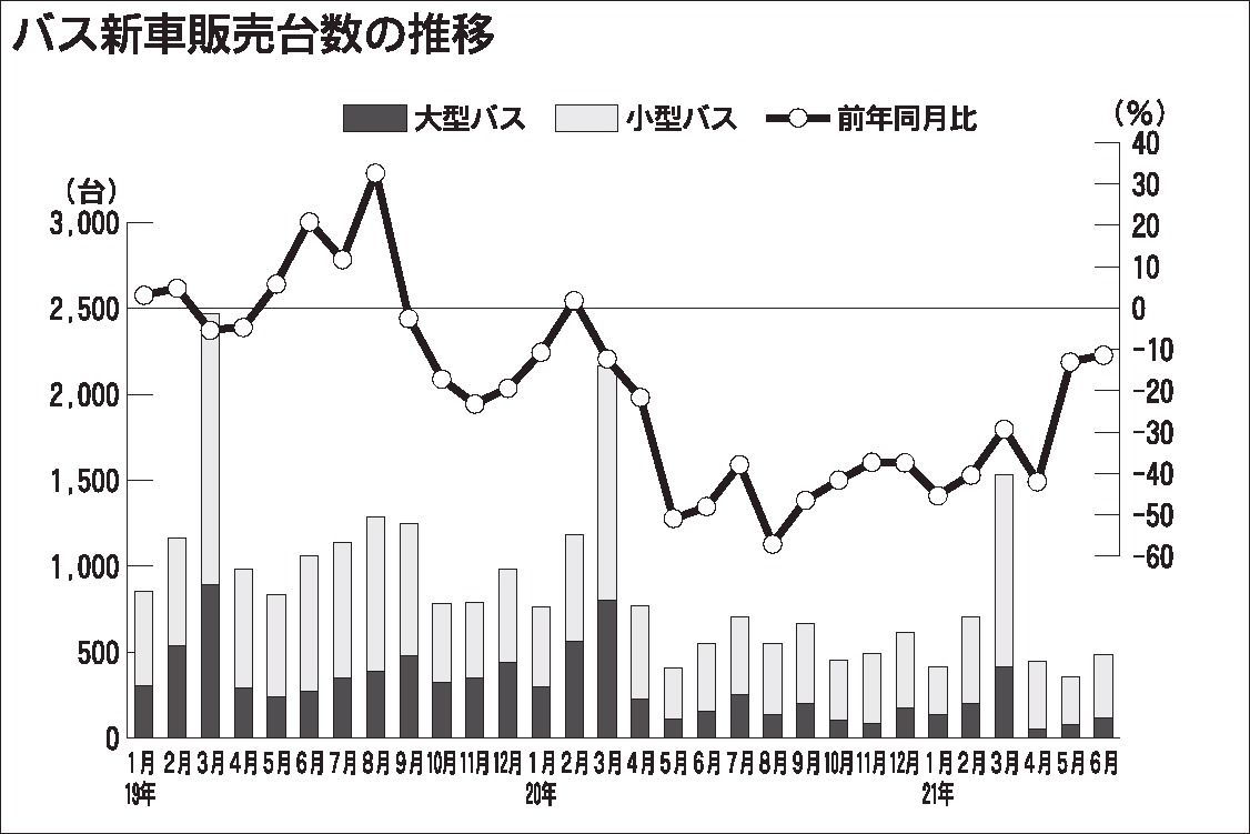 バス販売の苦境が続いている。2021年上期(1~6月)のバス新車販売台数は、前年同期比32・5%減の3945台だった。新型コロナウイルス感染拡大前の実績から半数近い水準にまで落ち込んで、上期としては過去最低だった。コロナ禍でインバウンド需...