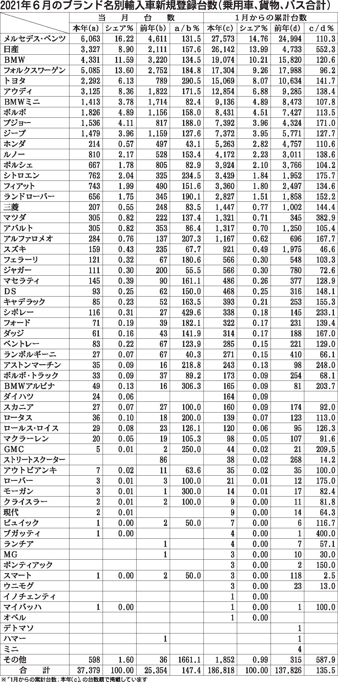 〈2021年6月のブランド名別輸入車新規登録台数(乗用車、貨物、バス合計)〉
