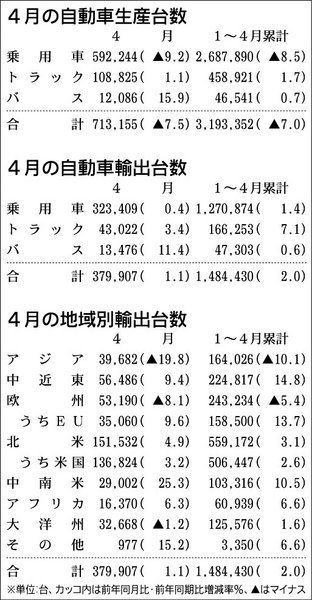 日本自動車工業会が29日発表した自動車国内生産実績によると、4月の四輪車生産台数は、国内新車市場が低迷したことから、前年同期比7・5%減と10カ月連続マイナスとなった。国内新車市場は、前年同月が消費増税前に発生した駆け込み需要の受注残の影...