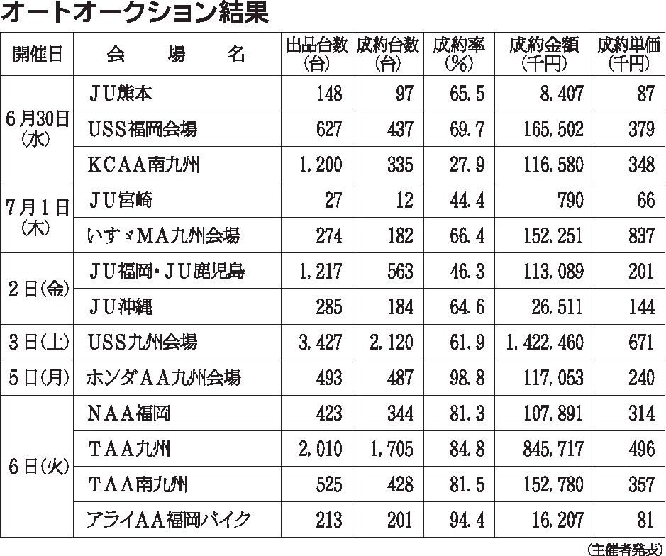 〈オートオークション結果〉九州地区 2021/6/30~7/6
