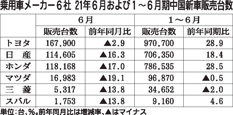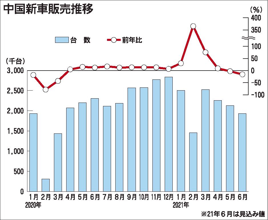 コロナ禍でも好調に推移してきた中国の新車市場が減速している。中国汽車工業協会が発表した6月の新車販売台数見通しは前年同月比16・3%減と2カ月連続マイナスとなったもようで、日本の自動車メーカー6社の中国の新車販売台数も全社がマイナスになっ...