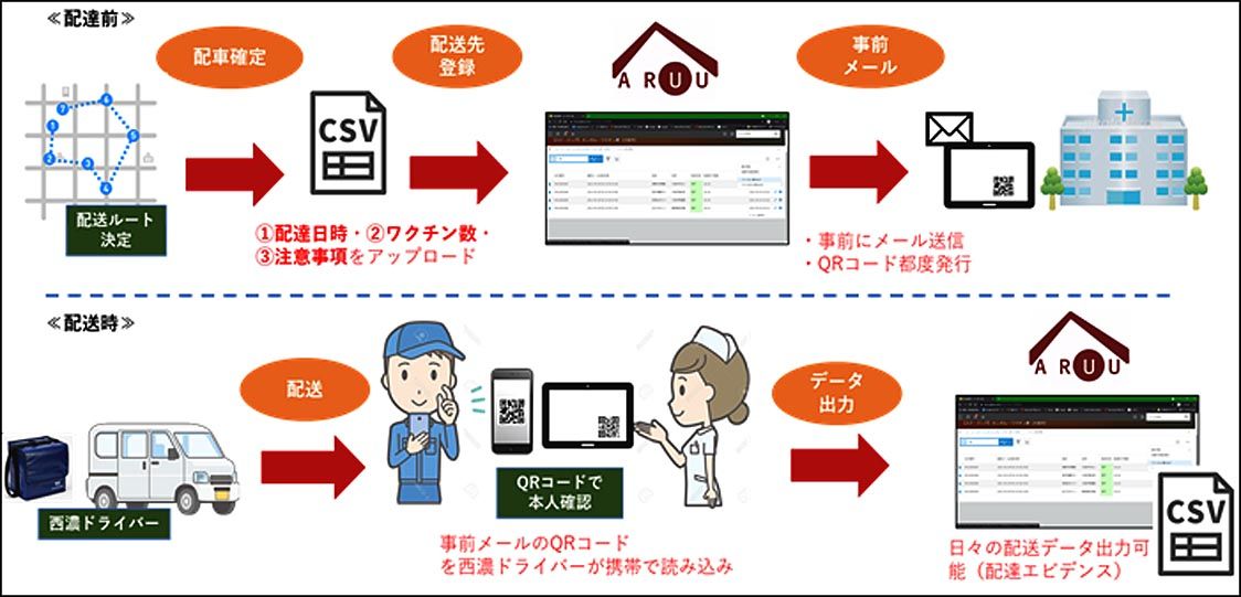 ワクチン輸送のスキームでは、配達前に受取人にメールでQRコードを送付し、それを配達担当ドライバーが携帯電話で読み取り本人確認を行う。すでに同社の地元の岐阜県大垣市が導入した。ワクチン以外でもより確実な配達が求められる場合にこのスキームが効果的としており、利用の拡大を目指す。