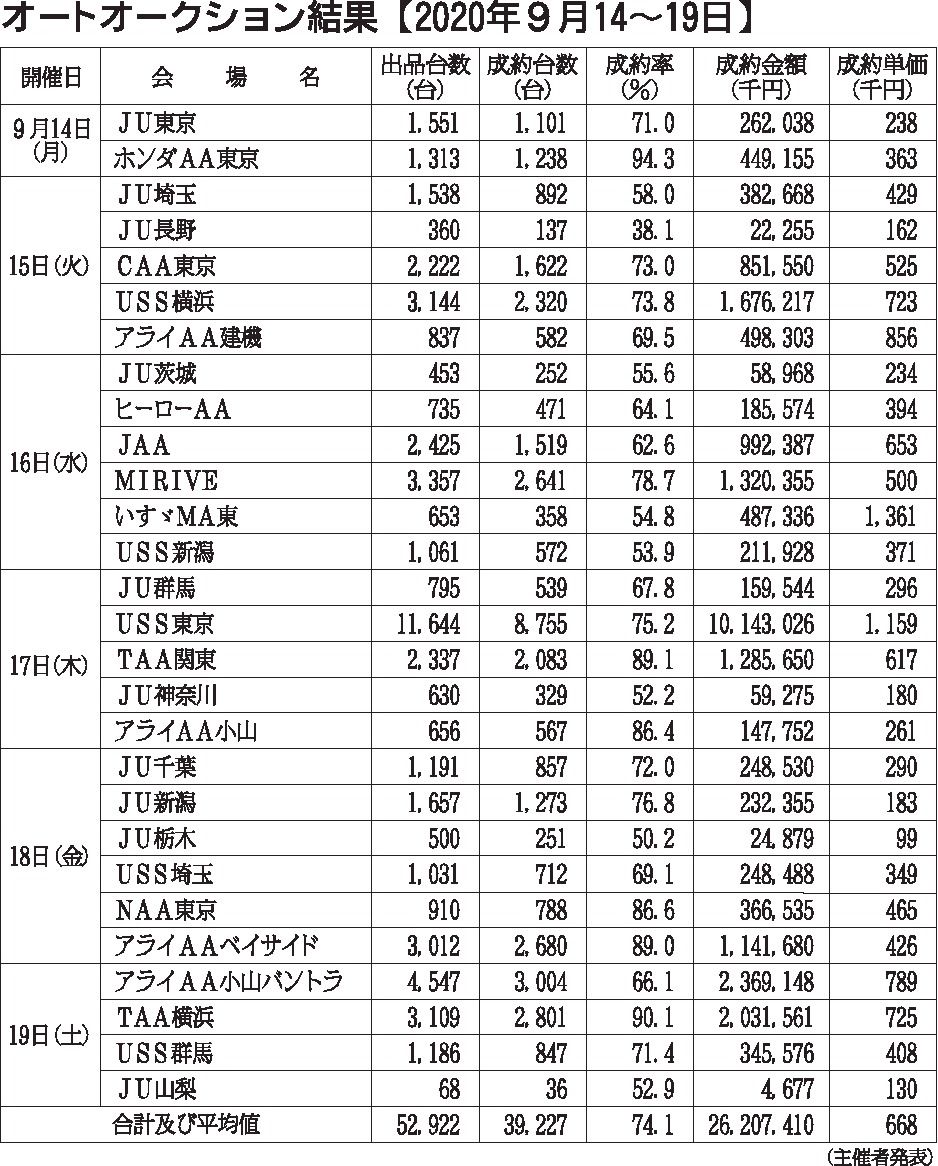 〈オートオークション結果〉首都圏 2020/9/14~19
