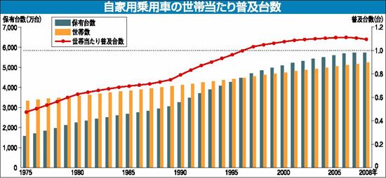 2008年3月末時点での自家用乗用車(軽自動車・登録車)の世帯当たり普及台数は1・095台となり、前年の1・107台から0・012台減少した。06年に1・112台と過去最高を記録してから、2年連続の減少となった。世帯数が毎年50万~60万...
