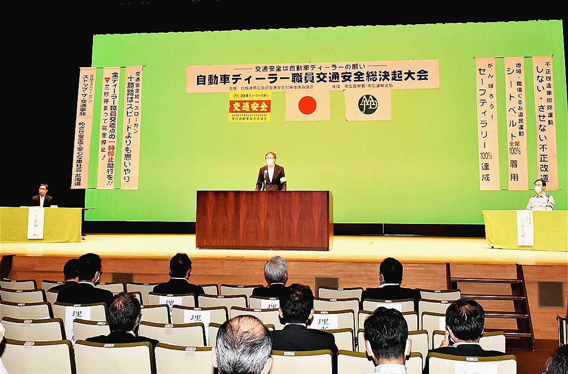 【帯広】自販連帯広支部交通安全対策推進協議会(若林剛会長)は8日、音更町文化センターで「自動車ディーラー職員交通安全総決起大会」を開催した。昨年はコロナ禍で中止し、2年ぶりの実施。帯広地区新車ディーラーの代表者、社員ら500人が参加し、交...