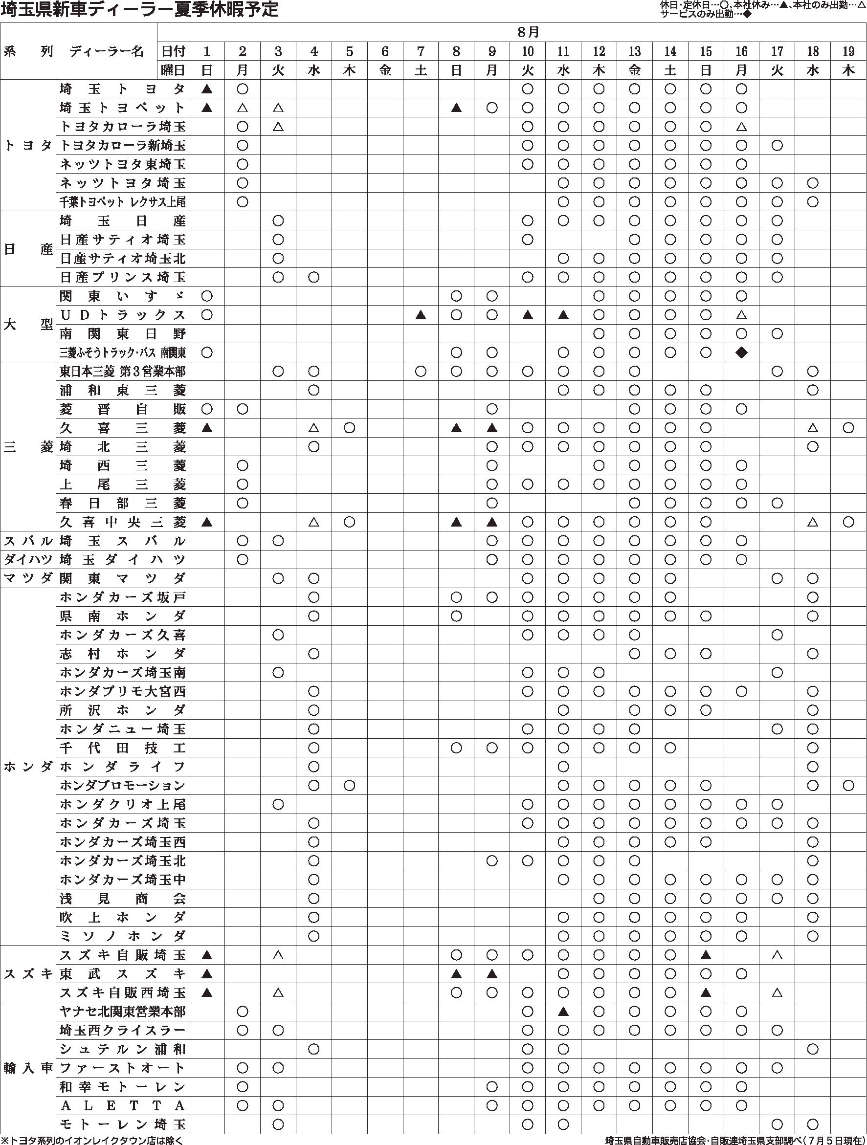 〈埼玉県新車ディーラー2021夏季休暇予定〉