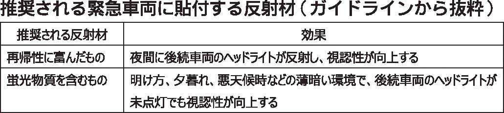〇緊急車両の視認性向上 緊急車両が路上で業務を行う際には交通事故の危険性が常に存在しています。こういった交通事故(同時に労務災害)を防ぐため、当学会と日本臨床救急医学会は合同で「緊急車両への反射材取り付けに関する学術的ガイドライン(令和元...