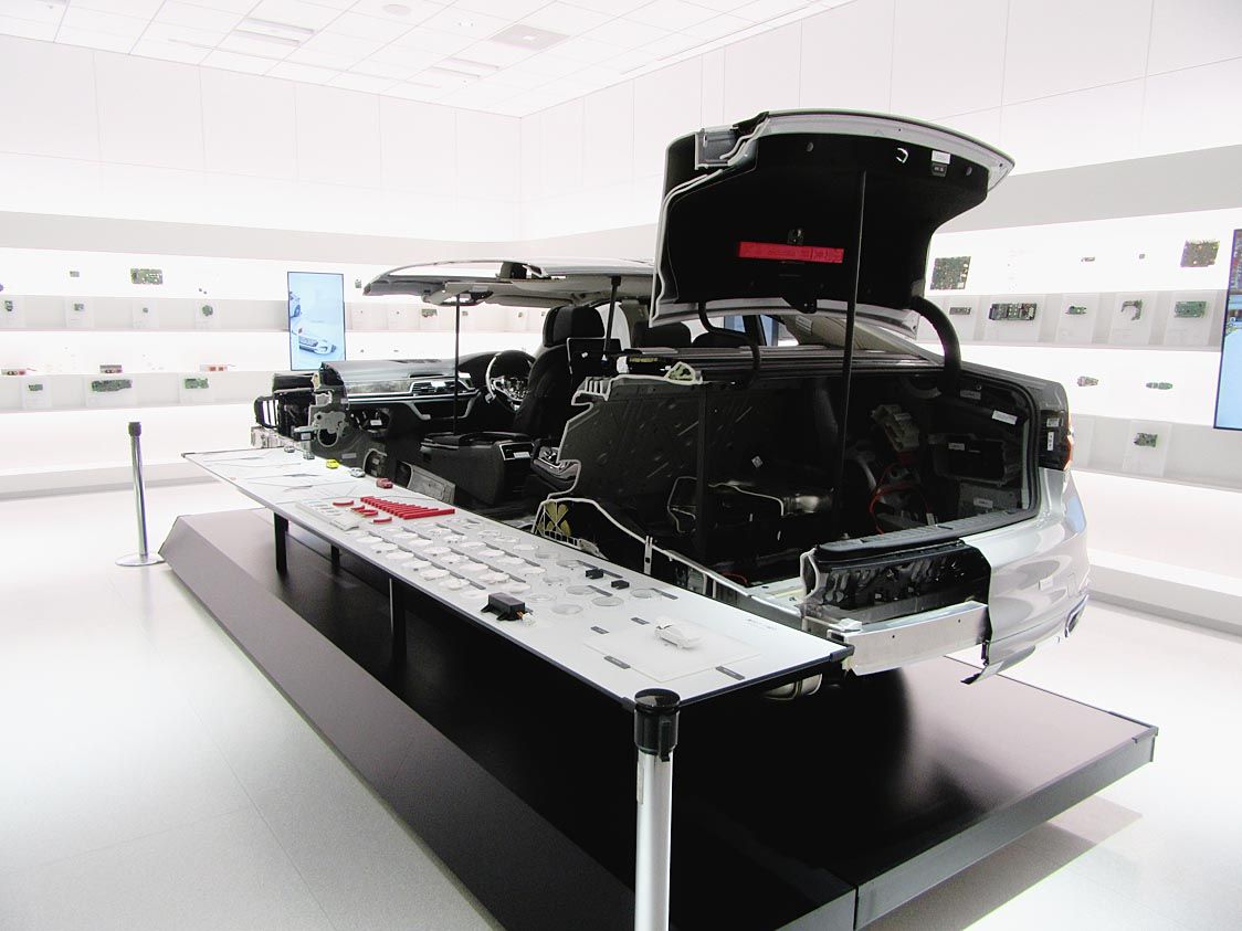 展示室では、同社が電子部品の使用状況を確認するために行っている車両分解作業の実車や自動車用電子製品の展示、各種電子部品のデモンストレーションを行う超小型モビリティなどを配置した。
