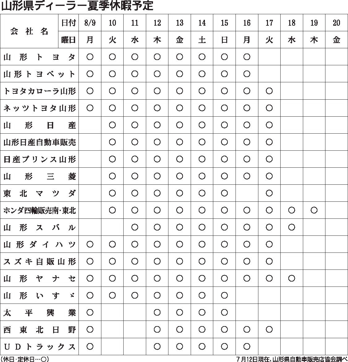 〈山形県ディーラー夏季休暇予定〉2021/8/9~20