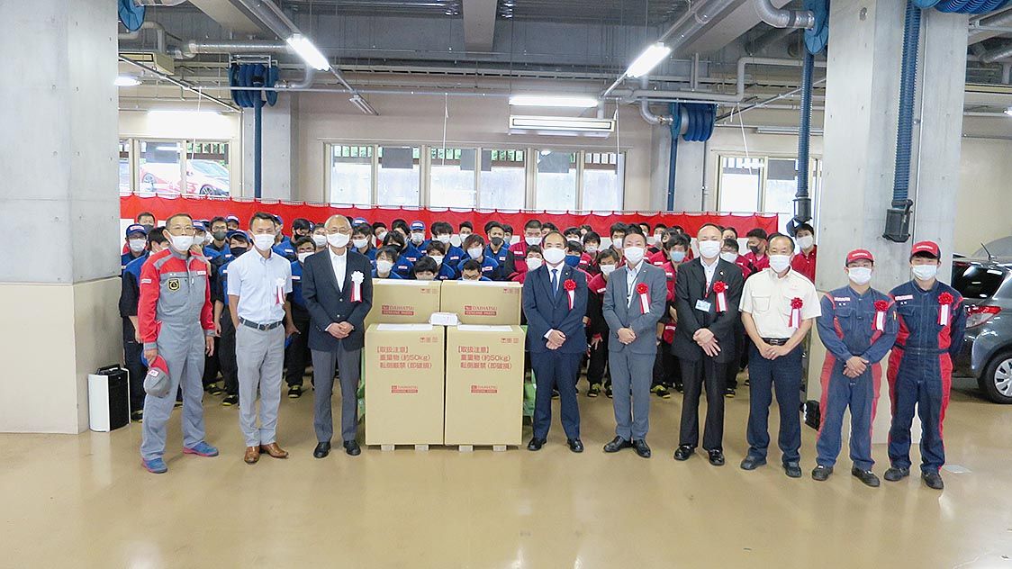 北九州ダイハツ(勢純一社長)と福岡ダイハツ(内山邦彦社長)は、北九州自動車大学校(籠谷正則校長、北九州市)に、実習用教材として「ハイゼットトラック」のエンジンとトランスミッションなどを寄贈した=写真。 同校で16日に開いた贈呈式で、勢社長...