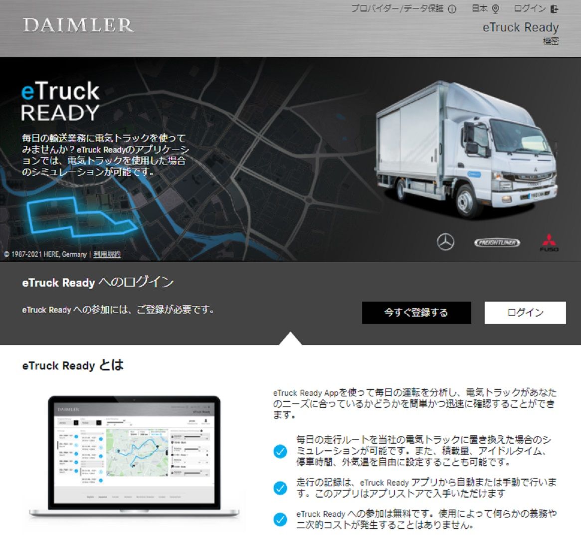 ダイムラートラックが開発した「eトラックレディApp」の対応車種にeキャンターを追加し、日本、欧州、オーストラリア、ニュージーランドでリリースする。アプリは車両位置、速度、加速度、高度などのデータを収集し、1回の充電で通常の走行ルートをどの程度カバーできるか分析できる。架装、外気温、積載量、アイドリング時間などを設定することで精度をより高めることもできる。料金は無料。