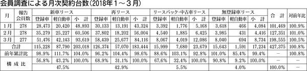 日本自動車リース協会連合会(JALA、東馬圭一会長)は、会員会社の2018年1~3月の自動車リース契約台数を発表した。新車リースは前年同期比4・0%増の20万3018台だった。 登録車(排気量660cc超)は前年同期で微減だったが、軽自動...
