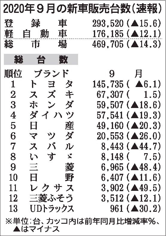 登録車と軽自動車を合わせた9月の新車販売台数は、前年同月比14・3%減の46万9705台となり12カ月連続で前年を下回った。前年9月が消費税増税前の駆け込み需要によって高実績だった中、前の月よりもマイナス幅を縮めた。ブランド別では、スズキ...