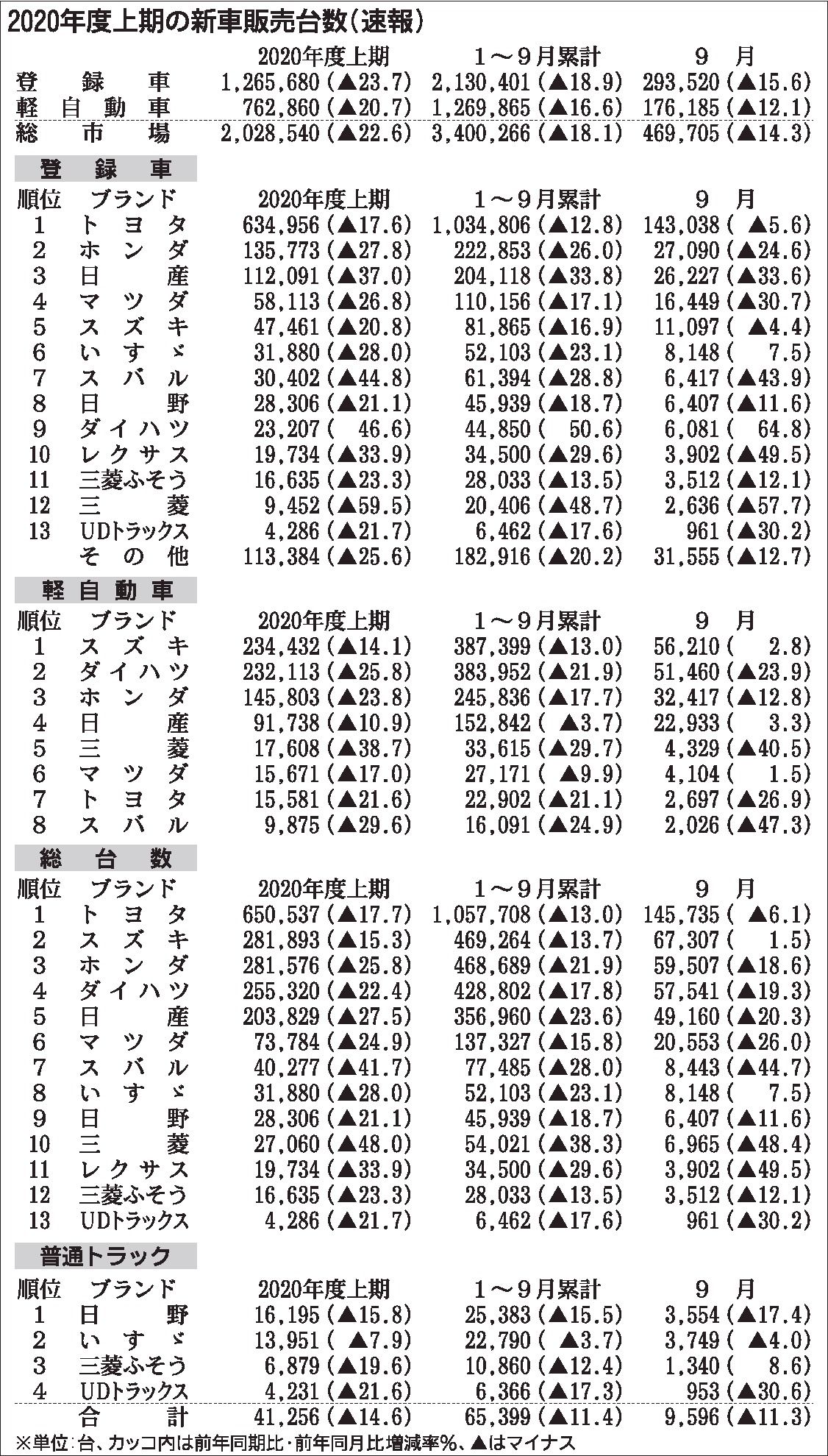 〈2020年度上期の新車販売台数(速報)〉