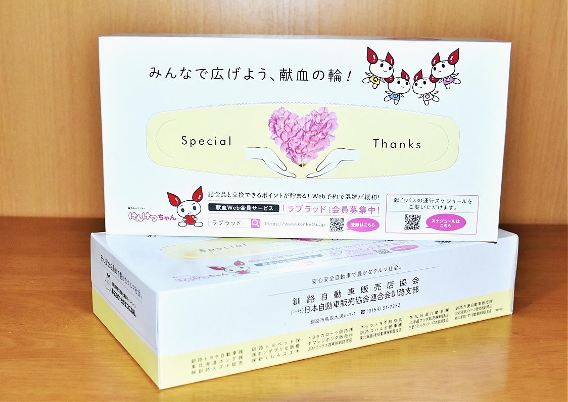 【釧路】コロナ禍で低迷する献血活動を応援―。自販連釧路支部(坂根篤支部長)は、北海道赤十字血液センター釧路事業所にオリジナルデザインのボックスティッシュ1万箱(5箱パック2千セット、130万円相当)を寄贈した。献血者へのプレゼント用に提供...