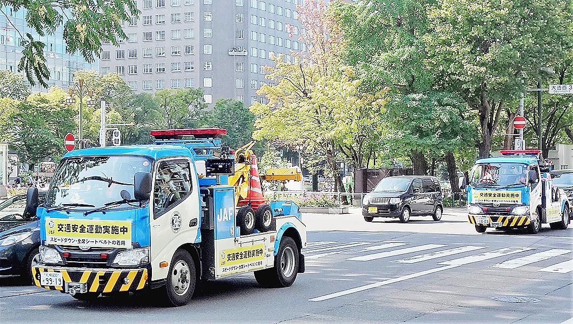 【札幌】日本自動車連盟(JAF)札幌支部(横井隆支部長)は「交通安全パレード」を実施した。レッカー車2台で追従走行し、ドライバーらに交通安全を呼び掛けた=写真。 秋の交通安全運転に合わせた恒例行事で、速度制限順守や全席シートベルトの着用な...