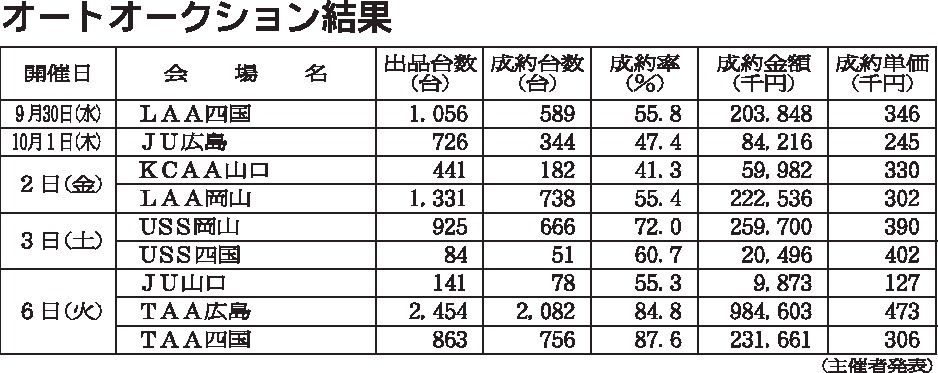 〈オートオークション結果〉中四国地区 2020/9/30~10/6