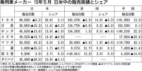 日本の乗用車メーカー、5月の日米中販売 米販売やや足踏み