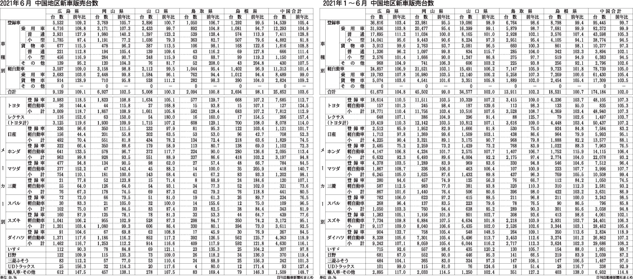 中国地区の2021年上期(1~6月)の新車販売台数は、前年同期比2・0%増の17万4184台となり、2年ぶりに増加した。登録車が0・3%減の9万5445台で微減だったものの、軽自動車は5・0%増の7万8739台と堅調に伸長した。新車販売総...