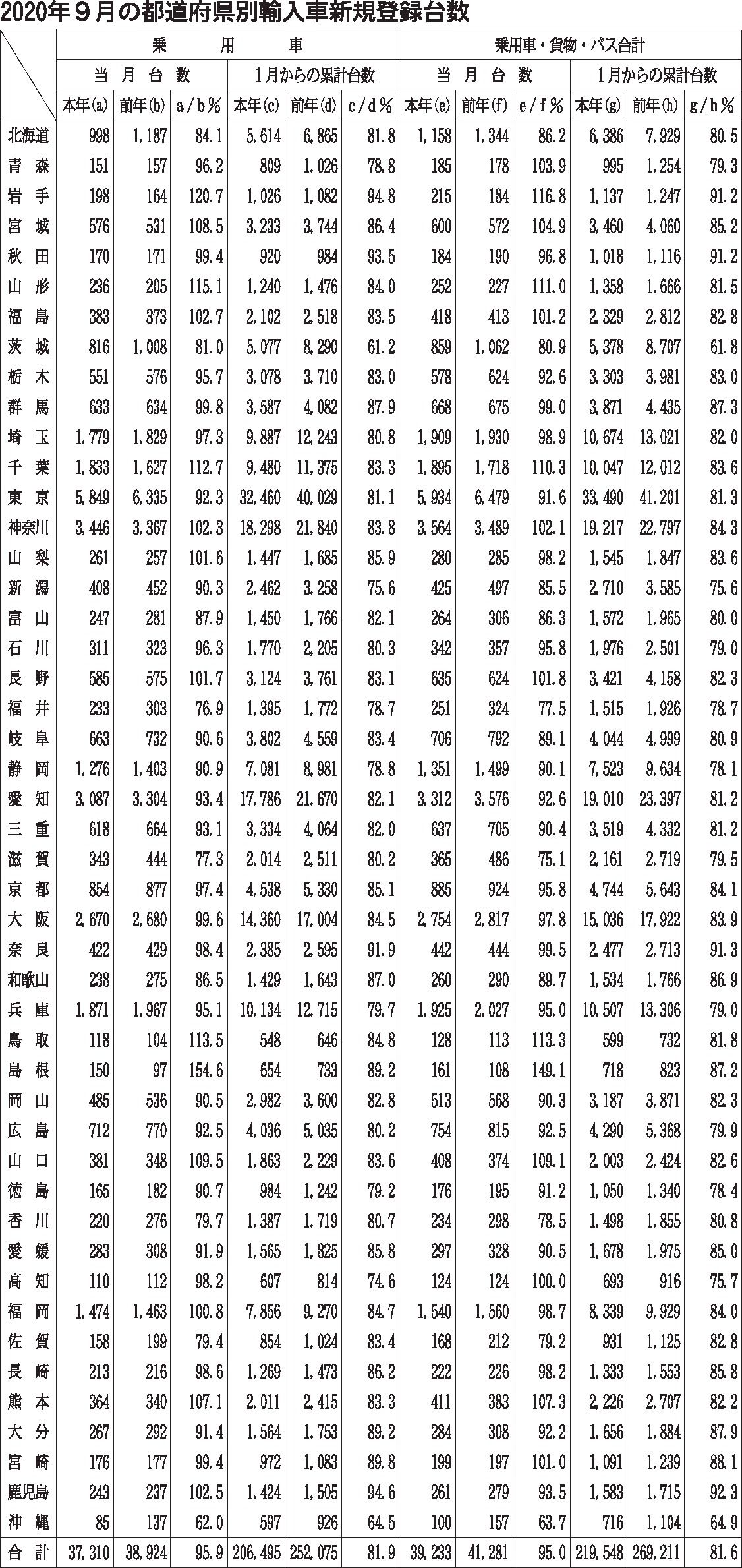 〈2020年9月の都道府県別輸入車新規登録台数〉