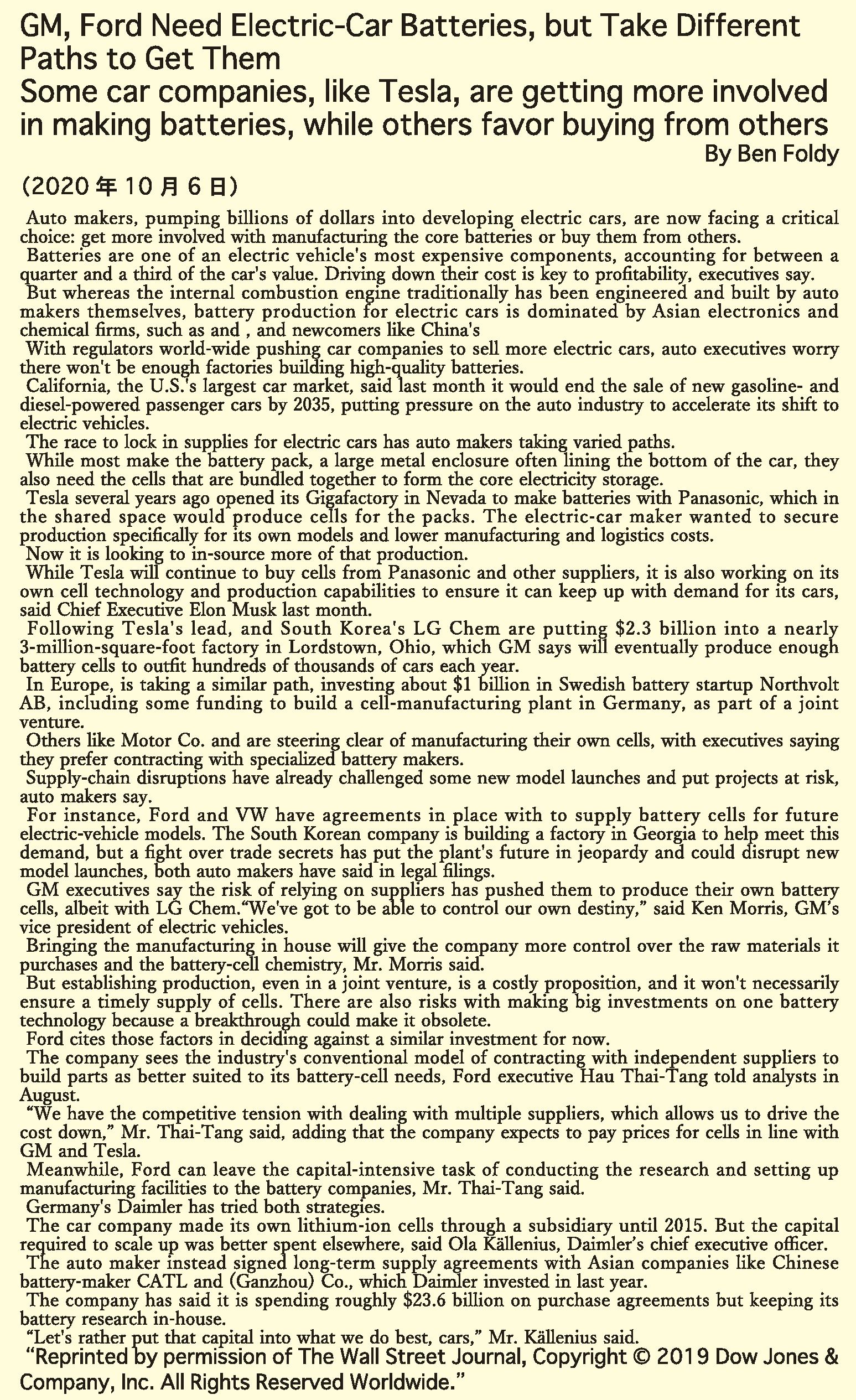 By Ben Foldy2020 年 10 月 6 日 電気自動車(EV)の開発に多額を投じる自動車メーカーは今、極めて重要な選択に直面している。バッテリーの中核部品をもっと自分たちで製造するか、他社から購入するかの選択だ。 バッテリーはE...