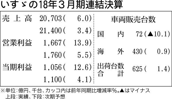 いすゞ自動車は14日、2018年3月期決算を発表した。売上高は前期比6・0%増の2兆703億円と6期連続で増収となり、初の2兆円超えを達成した。営業利益も2期ぶり、当期純利益は4期ぶりに増益となった。19年3月期はアジアでの成長などにより...