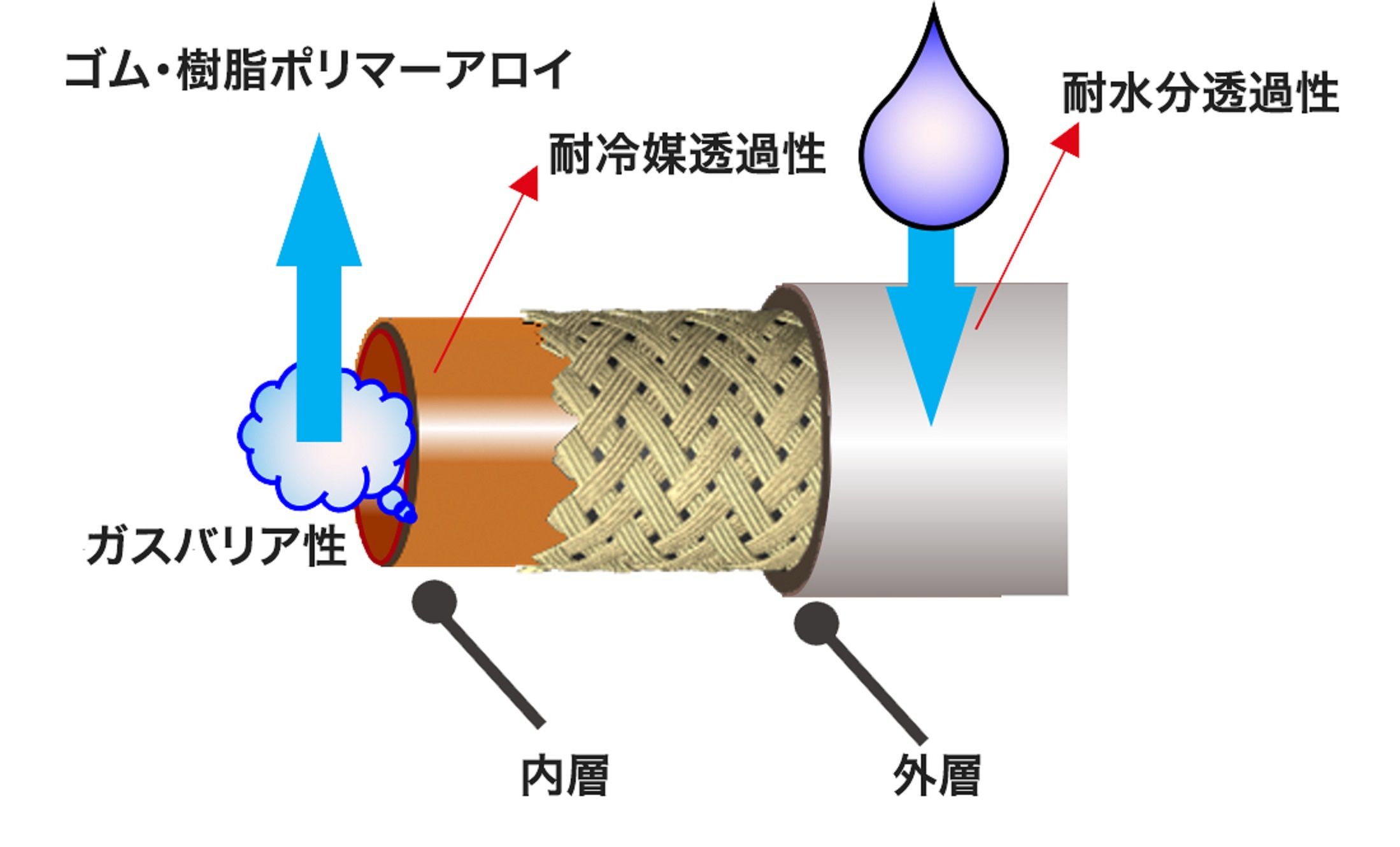 エアコンホースは、ゴム製やアルミ製が主流となっているが、今回は樹脂を採用して軽量化した。ホース材料の構造は、樹脂相の中に不連続にゴム相が散らばっている海島構造を用いる。これまでゴムでは目が粗くエアコンホース内を通過する冷媒が漏れてしまう課題があったが、樹脂はゴムに比べガスバリア性が高く、冷媒の漏れを防止できるという。