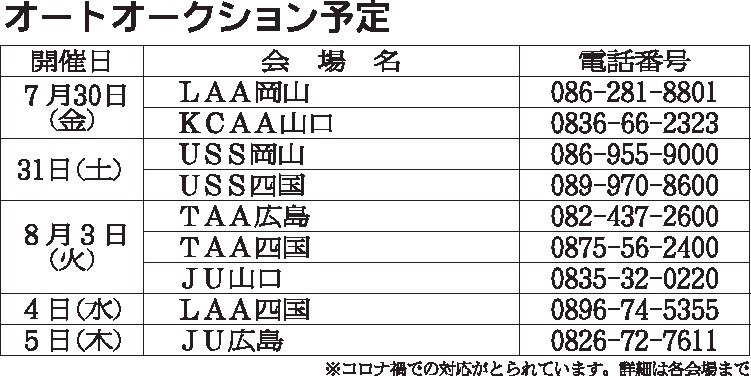 〈オートオークション予定〉中四国地区 2021/7/30~8/5
