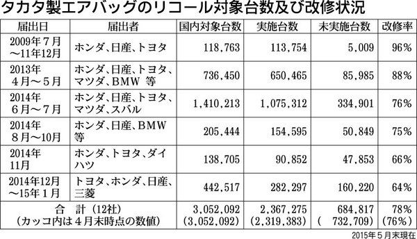国土交通省は、タカタ製エアバッグのリコール(回収・無償修理)進ちょく状況を公表した。4月末時点の対象台数(約305万台)ベースの改修率は78%と前月に比べ2ポイント上がった。ただ、5月にタカタが米運輸省道路交通安全局に一部インフレーター(...
