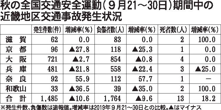 秋の全国交通安全運動(9月21~30日)期間中の近畿地区の交通事故発生状況がまとまった。警察庁の発表によると、近畿6府県の交通事故発生件数(速報値)は前年同期10・6%減の1485件だった。件数ベースでは177件減少した。 期間中の負傷者...
