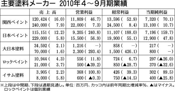 国内主要塗料メーカー5社の2010年4~9月期連結業績が出そろった。エコカー補助金の効果で国内の自動車生産台数が回復したことに加え、中国やインドなどアジアを中心と海外分野が好調で、5社すべてが増収増益となった。下半期は国内の自動車分野がエ...