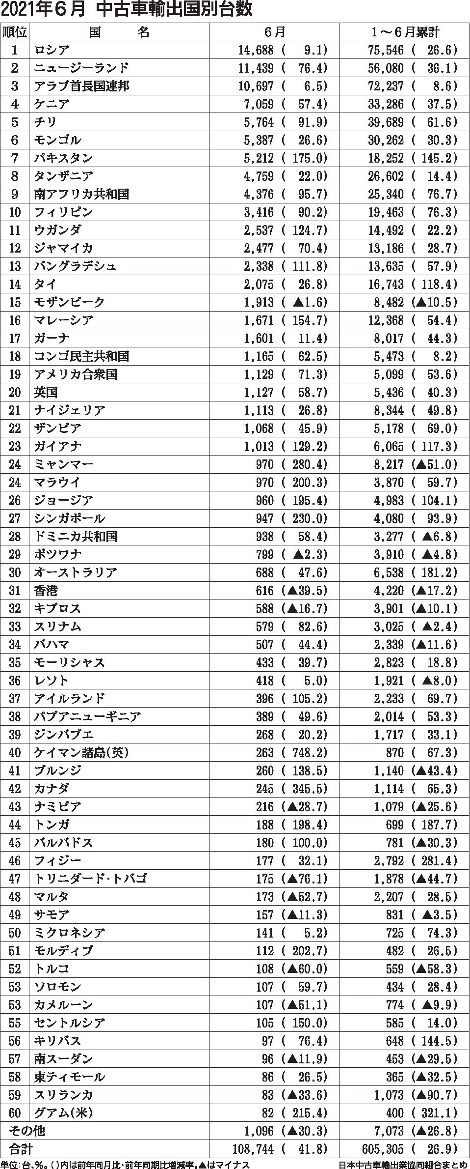 日本中古車輸出業協同組合(佐藤博理事長)がまとめた2021年上期(1~6月)の中古車輸出台数は、前年同期比26・9%増の60万5305台だった。上期として前年実績を上回ったのは2年ぶりとなる。前年の国内外における新型コロナウイルス感染拡大...