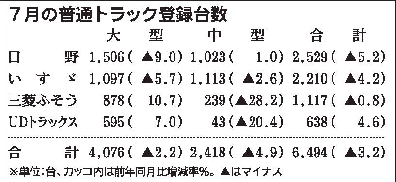 業界筋がまとめた7月の普通トラック(積載量4㌧トラック以上)販売台数は、前年同月比3・2%減の6494台だった。3カ月ぶりのマイナス。メーカー別ではUDトラックスが同4・6%増となり唯一、前年実績を上回った。日野自動車は同5・2%減、いす...