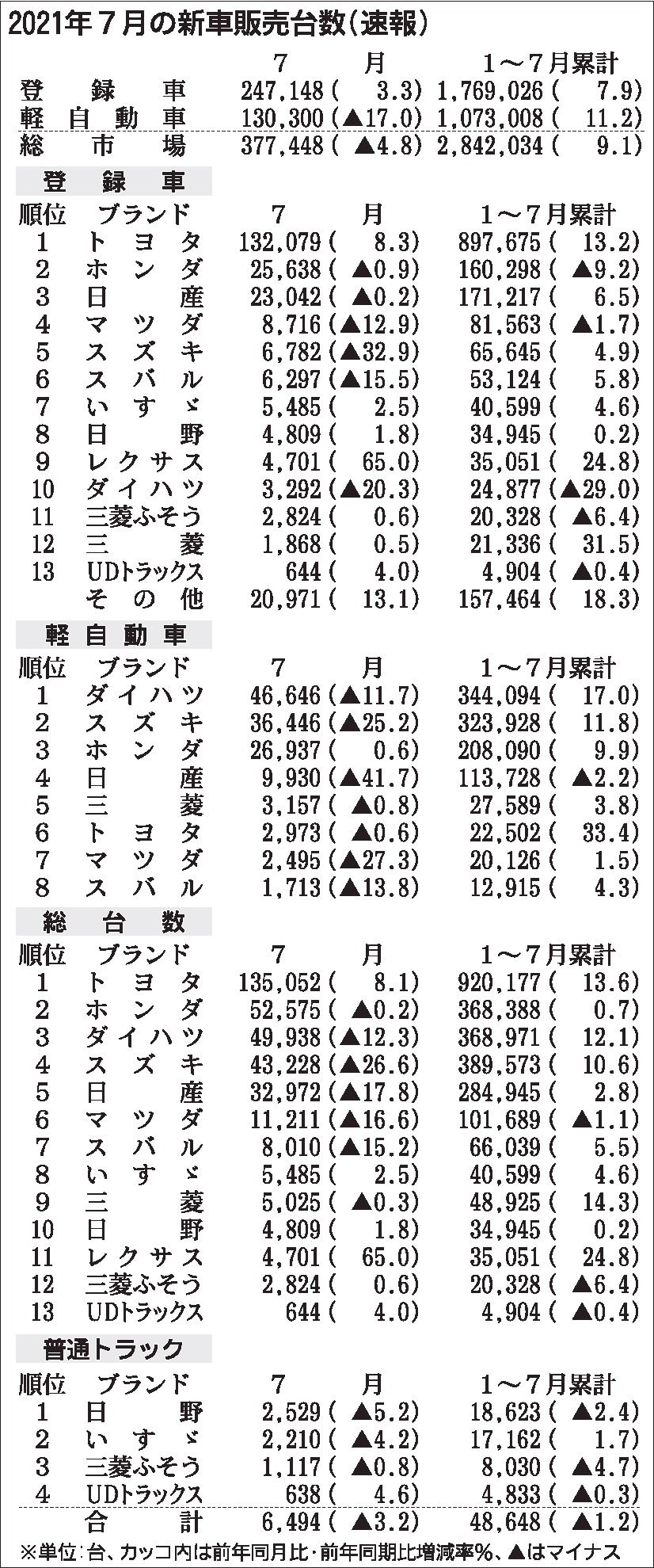 〈2021年7月の新車販売台数(速報)〉