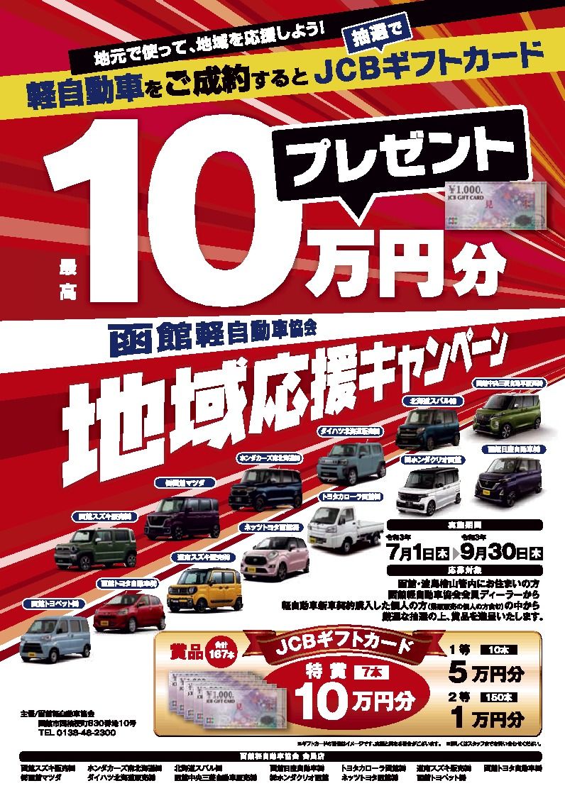 【函館】函館軽自動車協会(齋藤恭司会長)は、軽自動車購入者に抽選で商品券をプレゼントする「地域応援キャンペーン」を来月30日まで実施している。 同キャンペーンはコロナ禍を受けて停滞する地域経済を盛り上げようと、同協会に加盟する新車ディーラ...