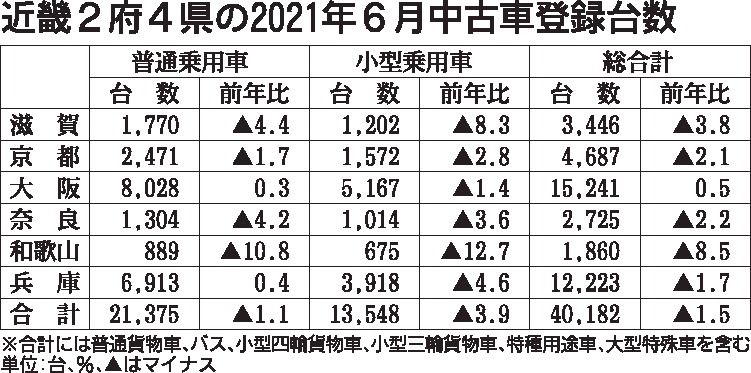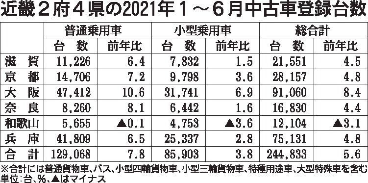 近畿2府4県の2021年上期(1~6月)の中古車登録実績(軽自動車を除く)がまとまった。新規・移転・変更手続きを合算した登録台数は、前年同期比5・6%増の24万4833台となり、コロナ禍以前の19年上期との比較でも4・6%増となるなど、2...