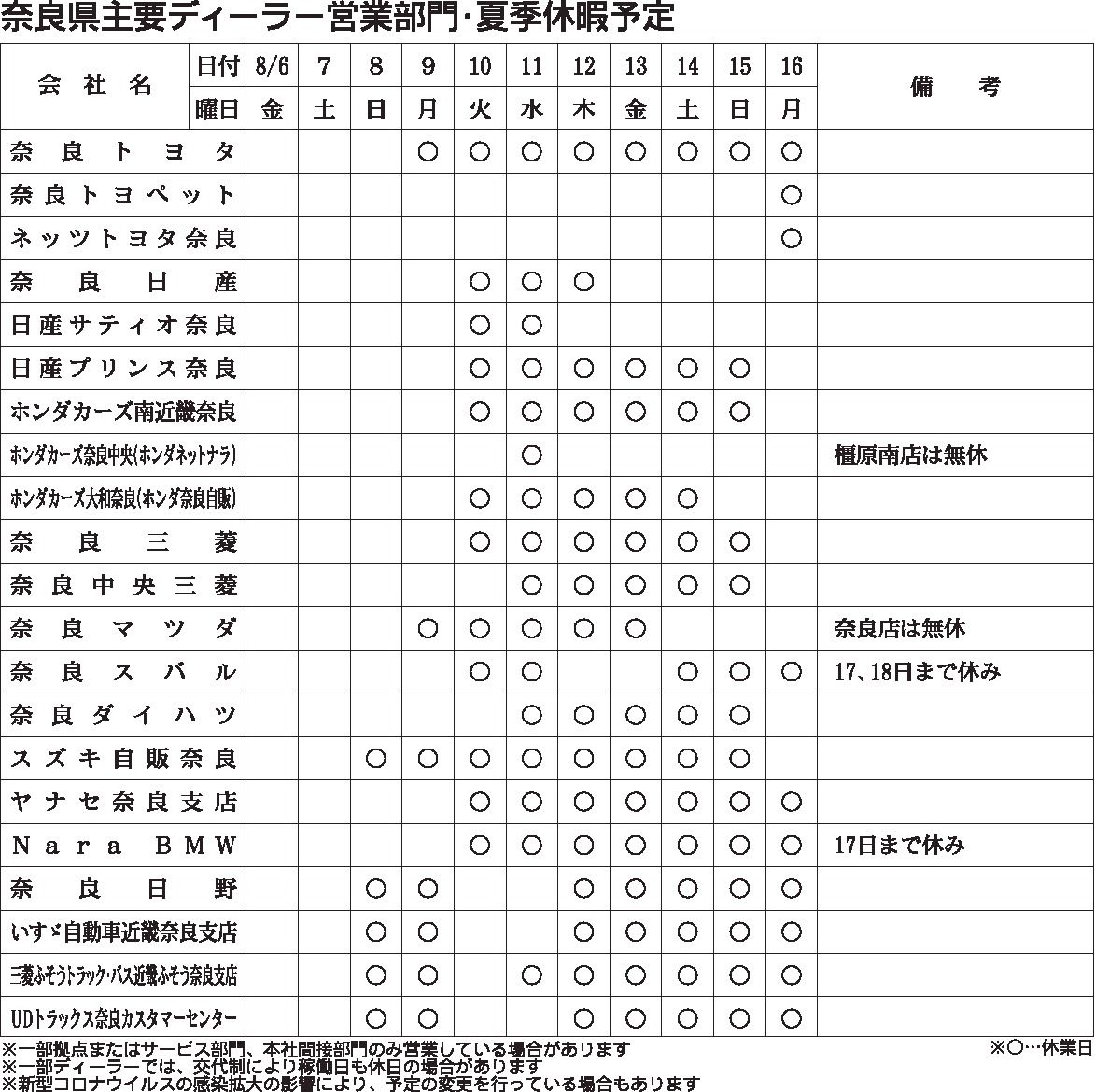 〈奈良県主要ディーラー営業部門・夏季休暇予定〉2021/8/6~16