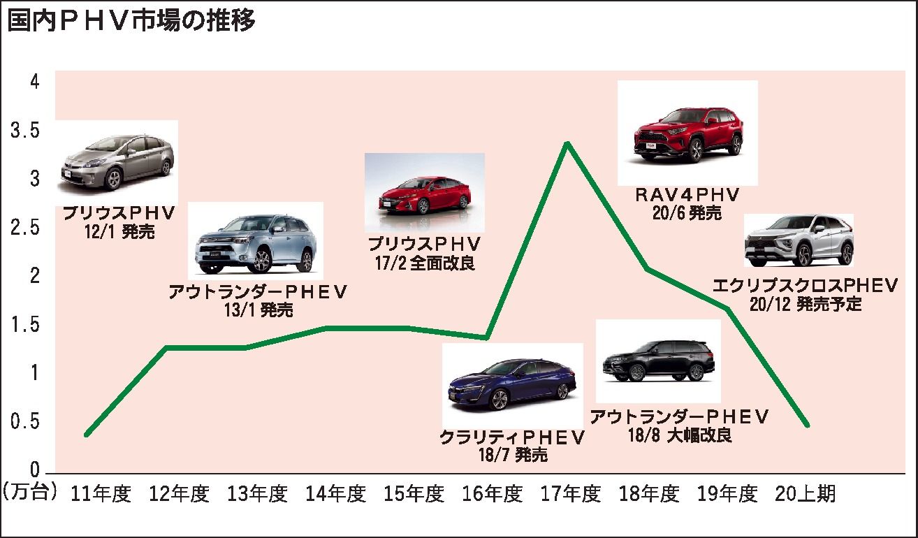 伸び悩んでいるプラグインハイブリッド車(PHV)市場が転換期を迎えそうだ。国内のPHV市場は2017年度に年間販売3万4千台に拡大し、普及の兆しを見せたが、その後は減少に転じ、19年度の実績は1万7千台と半減した。一方、足元ではトヨタ自動...