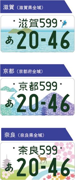 国土交通省が22日に発表した「地方版図柄入りナンバープレート」のデザイン。全国41地域で導入が決まったが、近畿からは「滋賀」「京都」「奈良」の3地域が選ばれた。10月頃から交付が始まる。3地域のプレートにはそれぞれ、風景や観光資源など地域...
