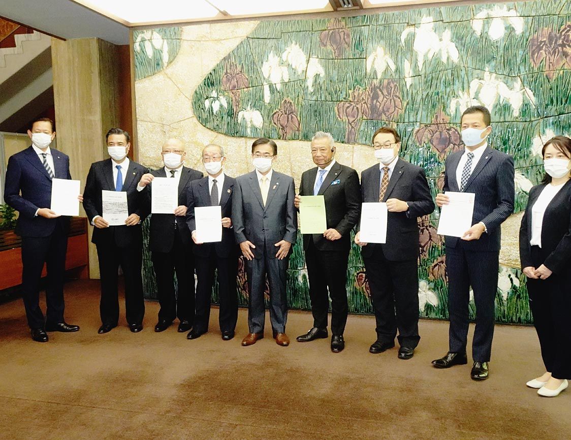愛知県の自動車産業に関連する経済、労働、自動車ユーザー団体など8団体の代表者らが愛知県公館(名古屋市中区)を訪れ、大村秀章愛知県知事に対して、自動車諸税に関する要望書を手渡した=写真。要望書は自動車の関連税負担軽減や補助金による購入支援な...