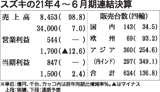 4~6月の業績は3期ぶりの増収増益となった。四輪車販売はインド、日本、欧州などの増加で同136.8%増の62万4千台に拡大。二輪車は同32.3%増の36万3千台になった。諸経費などの増加や原材料価格の上昇が減益要因となったものの、販売台数の増加と為替影響でカバーし、利益を積み上げた。